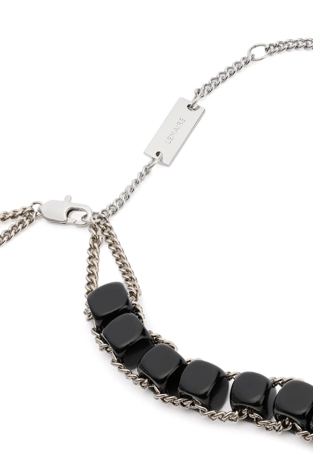 The Abacus line is reinvented this season in the LEMAIRE jewellery world. This Abacus Necklace is crafted in brass with a shiny silver finish with a rank of black onyx stones. This adjustable chocker will reflect the light while adding intrigue to the every day vestiaire.
