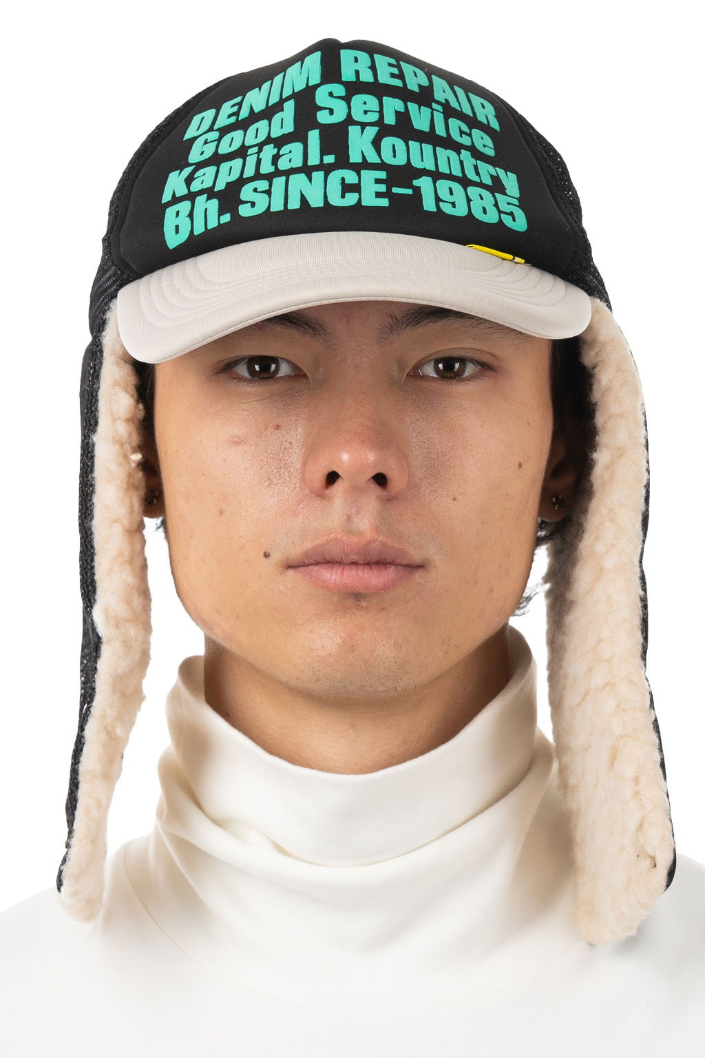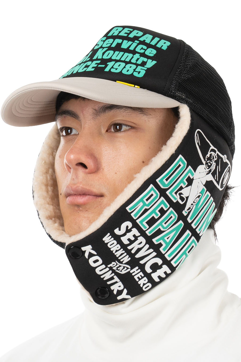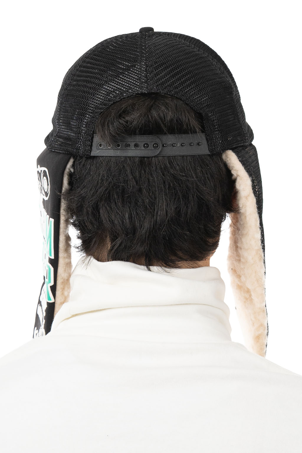 • The left and right earflaps have different designs with a printed design on the left and a mesh material on the right